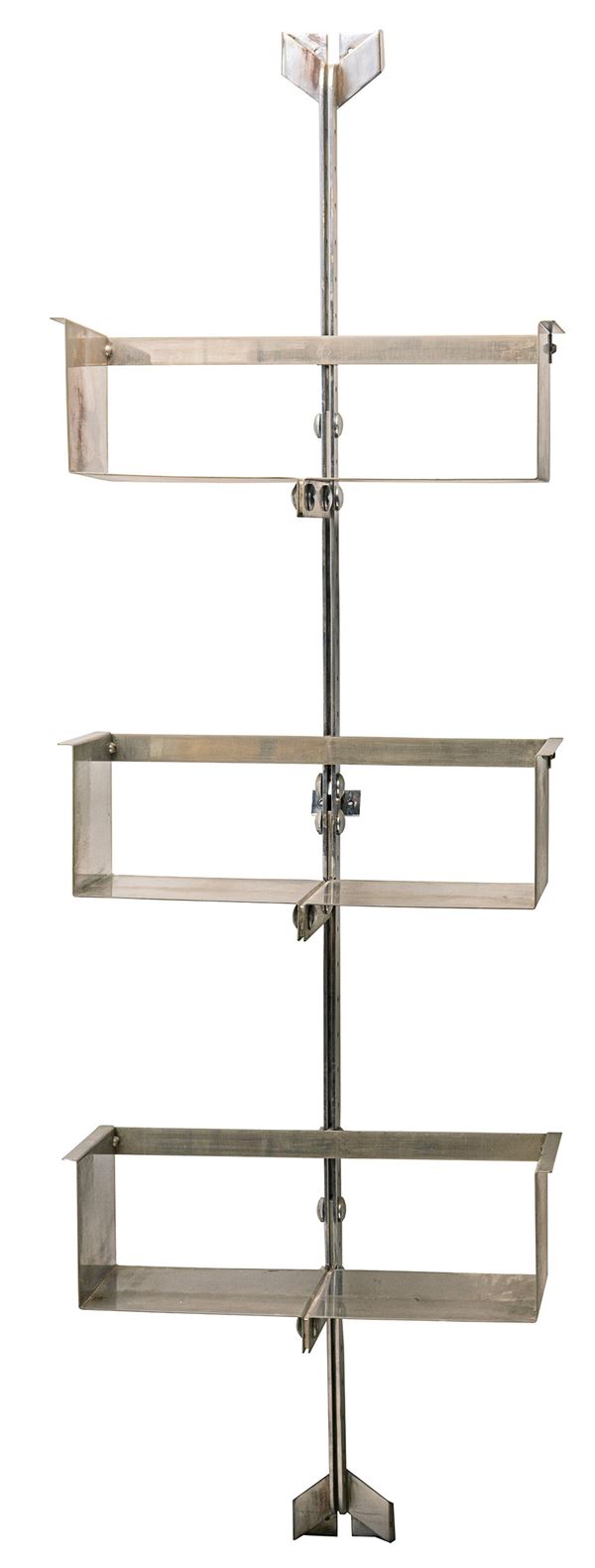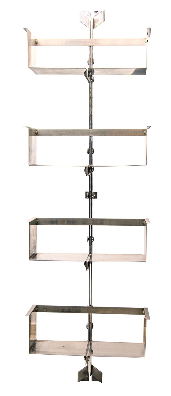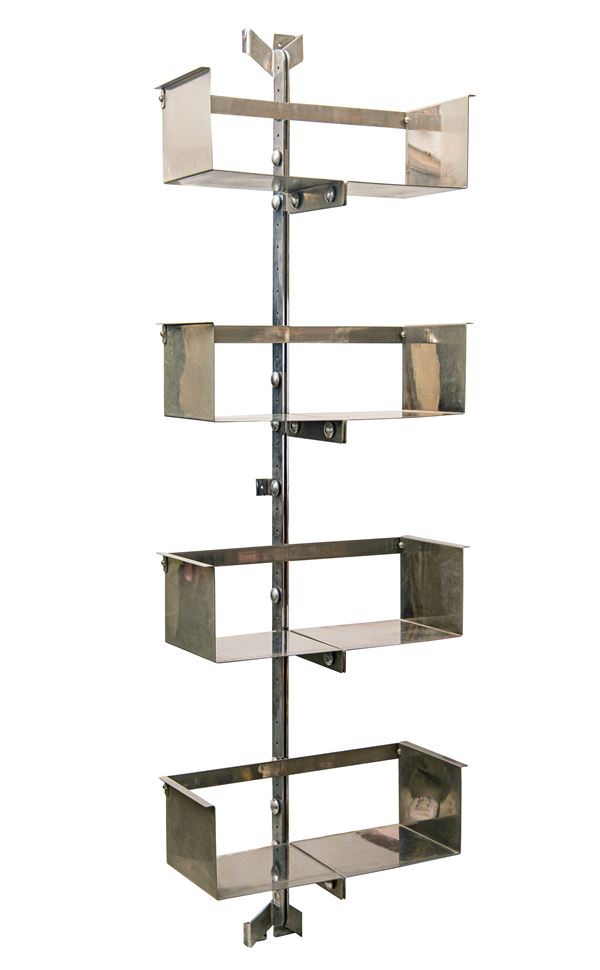 The three modular bookcases are currently composed of the following number of shelves: 4, 4 and 3. Overall, they are in good condition, with some signs of wear and oxidation.