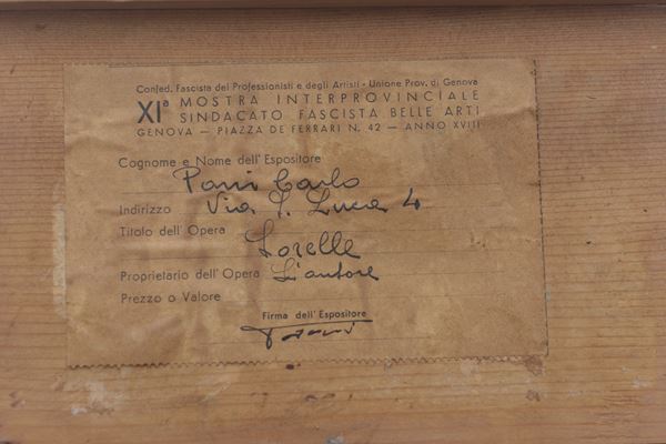 Signed and dated center right: C. Parri 1940 XVIII. Label on the back: XI Interprovincial Fascist Union Exhibition of Fine Arts. Genoa, year XVIII. Framed.