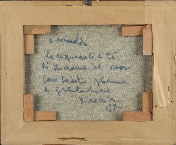 The work comes from the collection of Romualdo Farinelli, a well-known Perugian film distributor and promoter of important cultural events, made possible also thanks to his friendships with directors and painters. In the 1960s, driven by a deep respect for the major figurative artists of the time โ€” many of whom were personal friends, as evidenced by the personal dedications often present on the back of the canvases โ€” he began to commission exclusively abstract works from them, conceived as free creative divertissements. From this original initiative was born the collection entitled "I figurativi si divertono", completed during the 1970s. The catalogue presents 17 paintings belonging to this singular and precious nucleus.