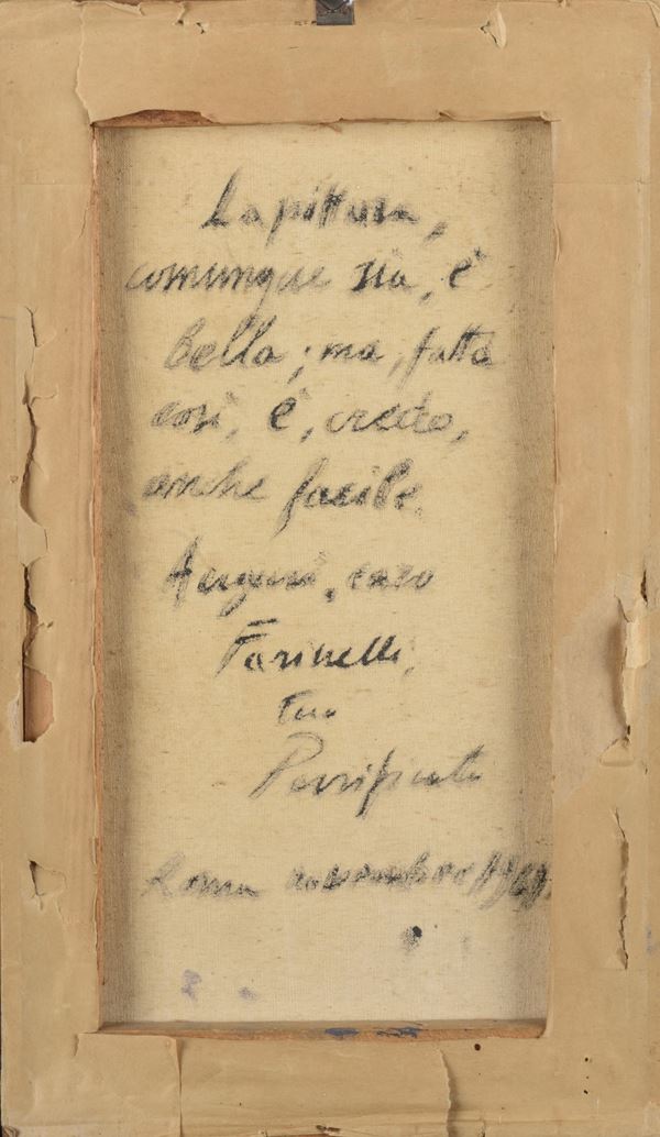 The work comes from the collection of Romualdo Farinelli, a well-known Perugian film distributor and promoter of important cultural events, made possible also thanks to his friendships with directors and painters. In the 1960s, driven by a deep respect for the major figurative artists of the time โ many of whom were personal friends, as evidenced by the personal dedications often present on the back of the canvases โ he began to commission exclusively abstract works from them, conceived as free creative divertissements. From this original initiative was born the collection entitled "I figurativi si divertono", completed during the 1970s. The catalogue presents 17 paintings belonging to this singular and precious nucleus.