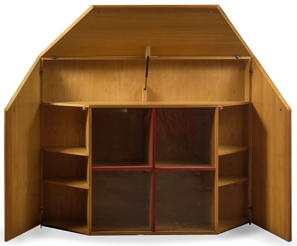 The sides and top plate are chamfered and hide a storage space. When opened, a mechanism moves the red-framed square glasses.