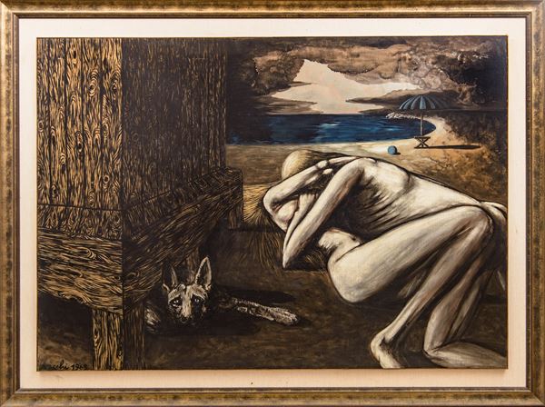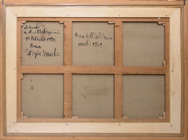 Autographed inscription on the back: "Dedicated to Lino Malagnini 15 February 1972 Rome Sergio Vacchi - land of the embrace, vacchi 1969".