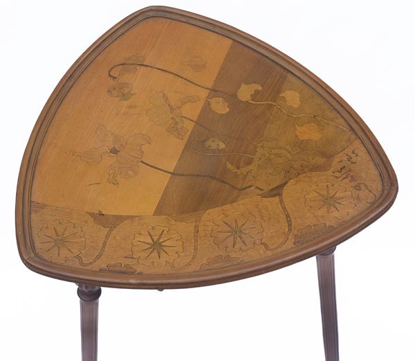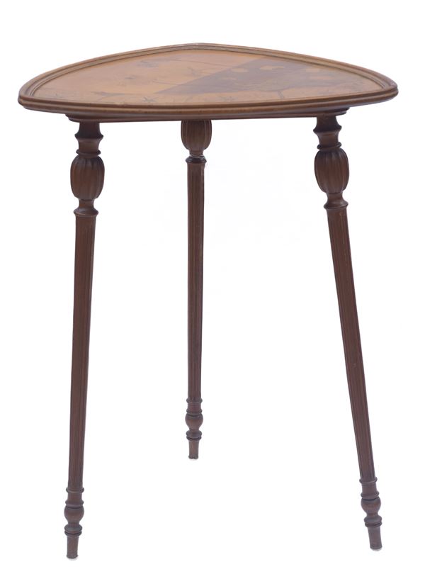 Tavolino da appoggio trilobato a tre gambe, con parchettatura a motivi floreali in diverse essenze (noce, arables e legni vari di frutto). Firmato.
