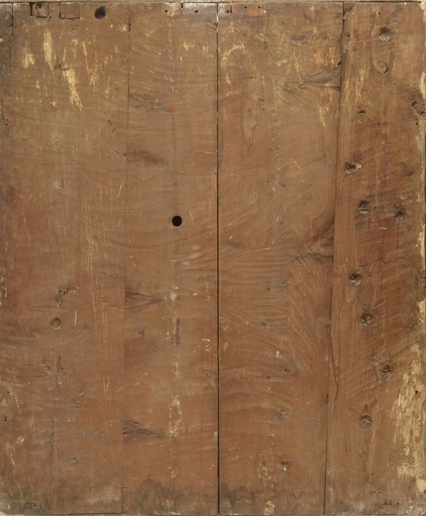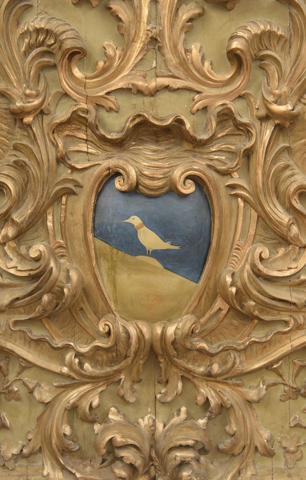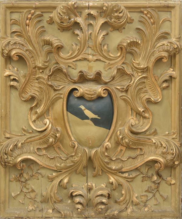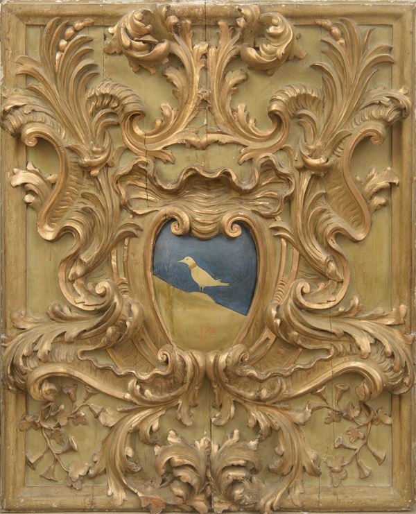 Legno intagliato e laccato con lumeggiature. Su pannello di pioppo. Periodo del Barocco, Luigi XIV, manifattura romana. Decorazione dello stemma araldico centrale non pertinente.