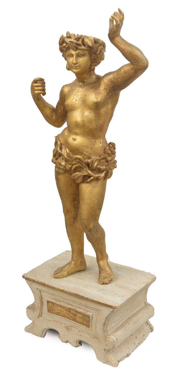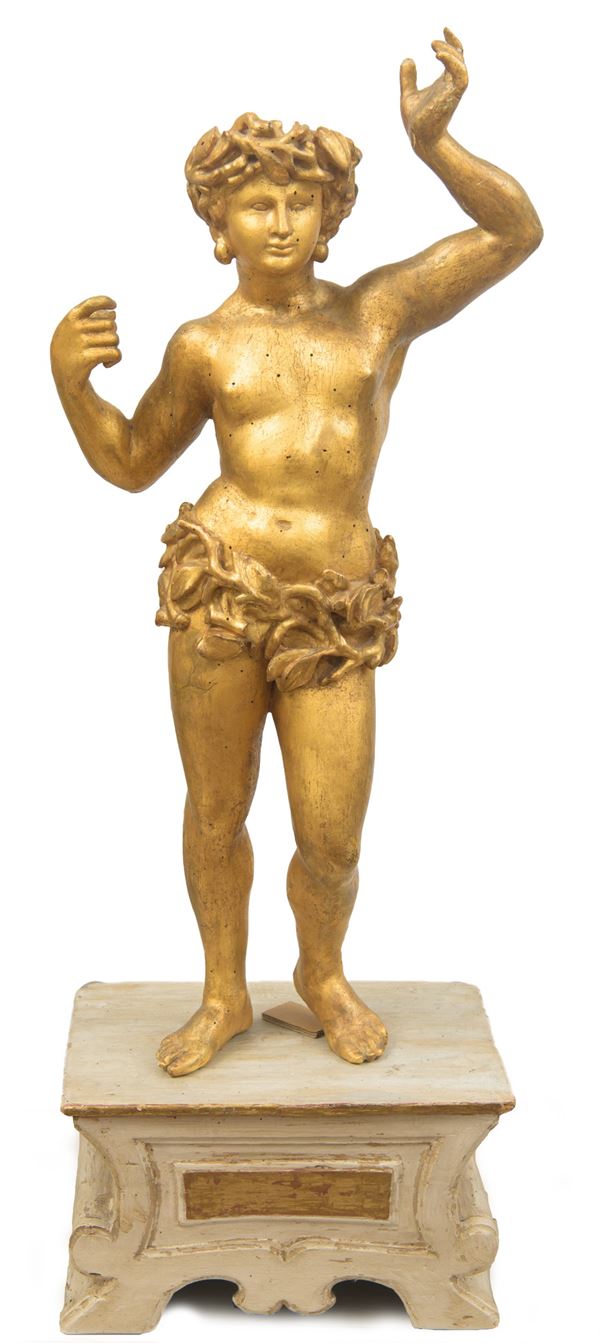 Scultura in legno dorato e intagliato raffigurante figura femminile. Poggiante su basamento in legno sagomato. Manifattura genovese, prima metร XVIII secolo. Restauri e mancanze.
