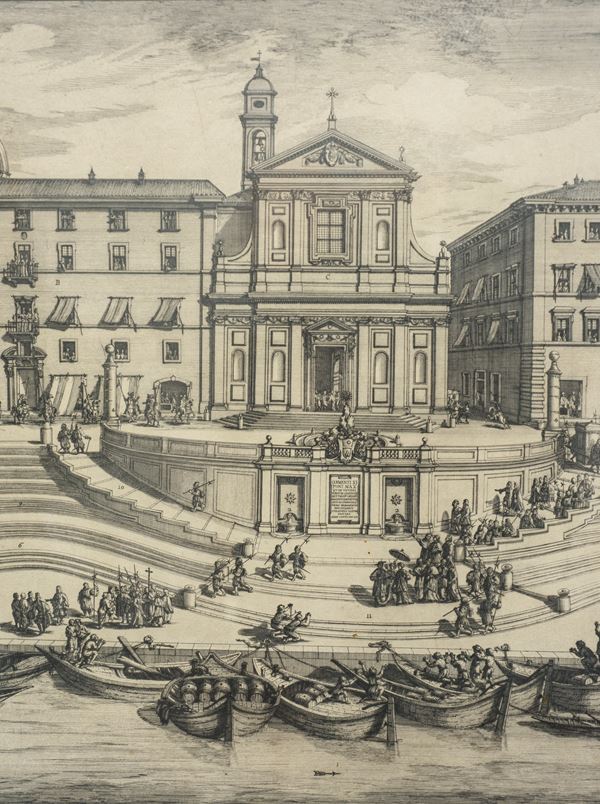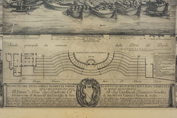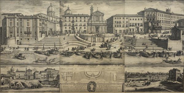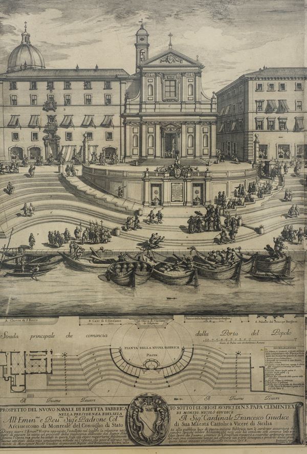 Grande veduta di notevole raritΓ  dello scalo tiberino stampata su 3 fogli da 3 lastre. Il prospetto costituisce una importante testimonianza documentaria del porto Clementino dopo la ristrutturazione della piazza antistante la chiesa di San Girolamo dei Croati e la costruzione della scalinata verso il fiume; i lavori furono affidati da Clemente XI ad Alessando Specchi e al maestro Carlo Fontana e terminarono nell'agosto del 1704. In basso la pianta della scalinata, affiancata da due vedute che testimoniano altrettante fasi della ristrutturazione; dedica dell'editore Domenico de Rossi (l'editore) al Cardinale Francesco Giudice Arcivescovo di Monreale