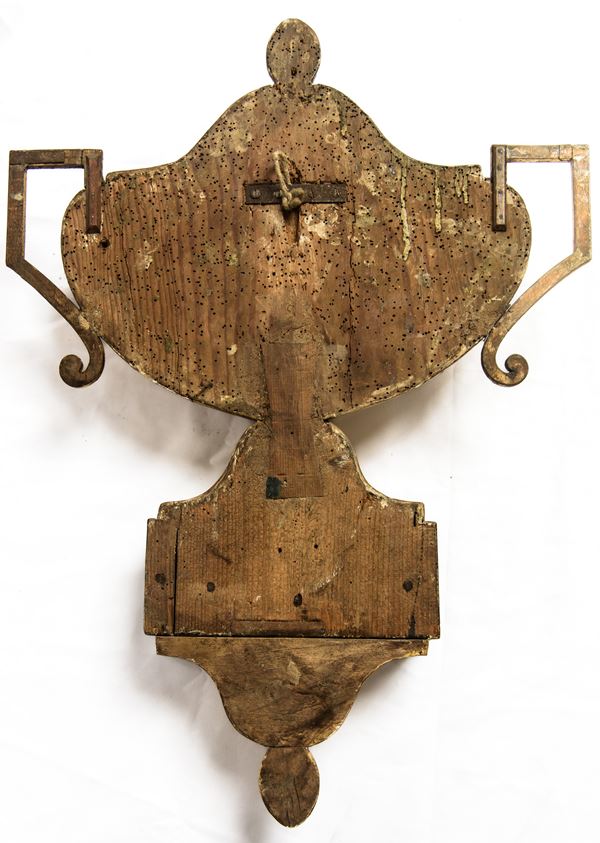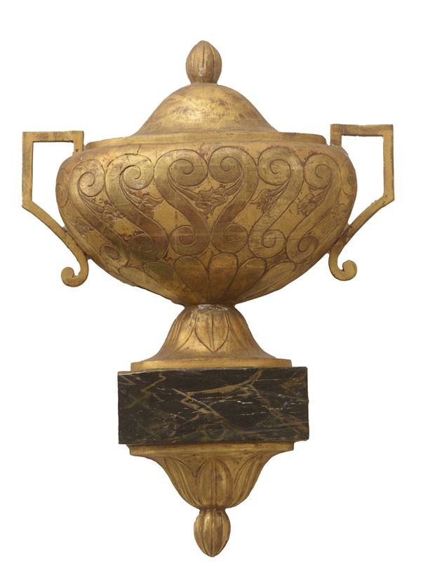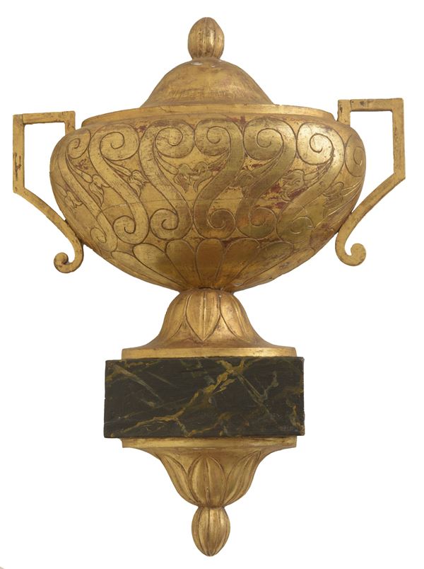 Gilded and decorated wooden double-handled amphorae of Renaissance form. Marbled base, engraved decoration.