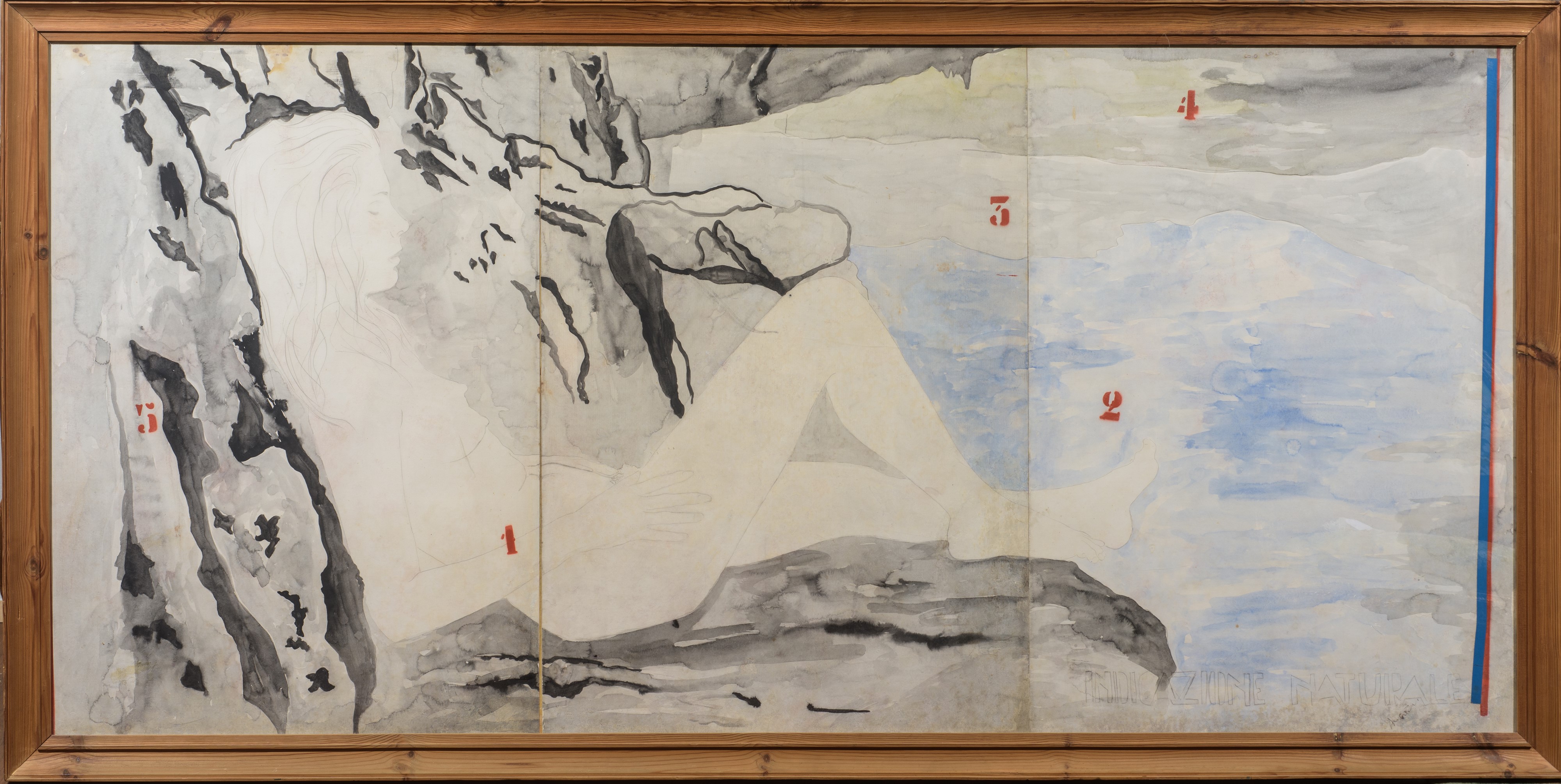 Opera iscritta e firmata in basso a destra: "Indicazione naturale - Angeli". Composta da tre fogli separati, applicati su unica tavola. Si ringrazia l'Archivio Franco Angeli per aver confermato l'autenticità dell'opera, attualmente in fase di archiviazione. In cornice