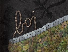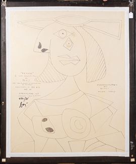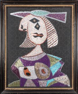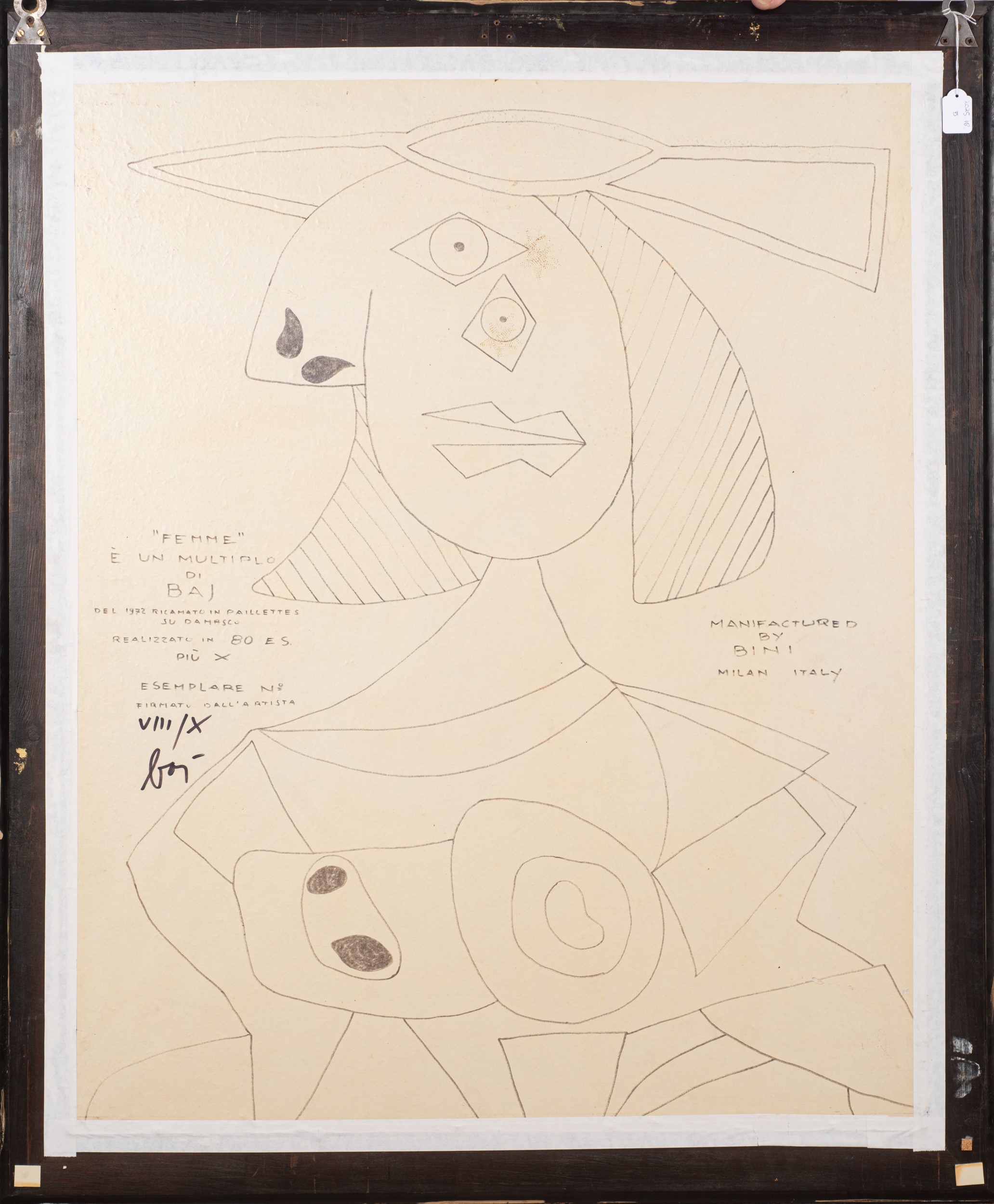 Es. n. VIII/X. Opera firmata in basso a sinistra: "Baj". Iscrizioni al verso: "Femme / è un multiplo7 di / Baj / del 1972 ricamato in paillettes / su damasco / realizzato in 80 es. / Più X / esemplare n. / XVIII/X / firmato dall'artista / VIII/X /Baj / manifactured / by / Bini / Milan Italy".