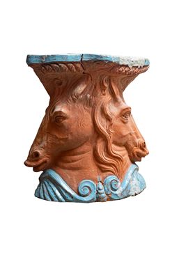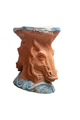 Decorato a teste equine bifronte. Terracotta smaltata di colore azzurro alla base