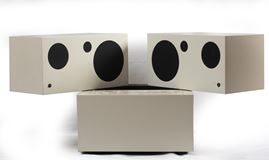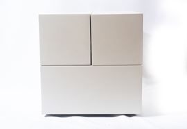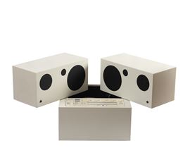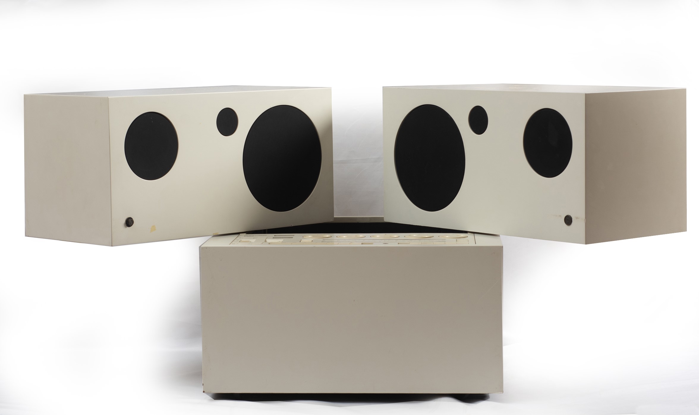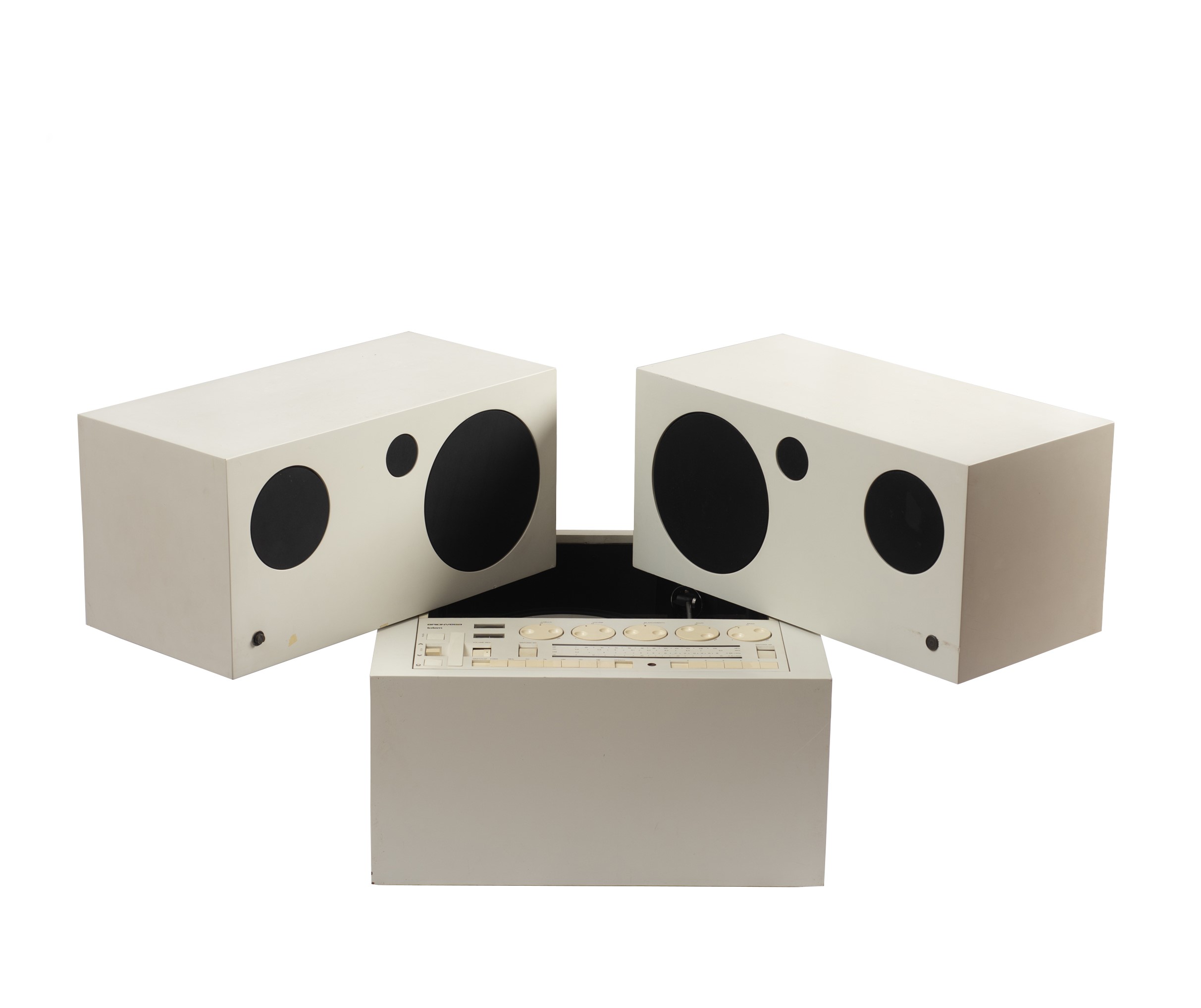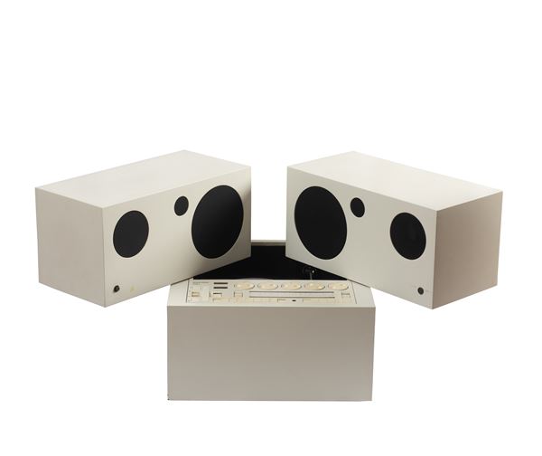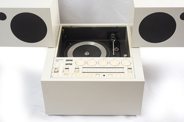 Mario Bellini per Brionvega. Struttura composta da tre moduli con all'interno un impianto stereo completo di Radio AM/FM e giradischi, diffusori acustici girevoli e rimovibili