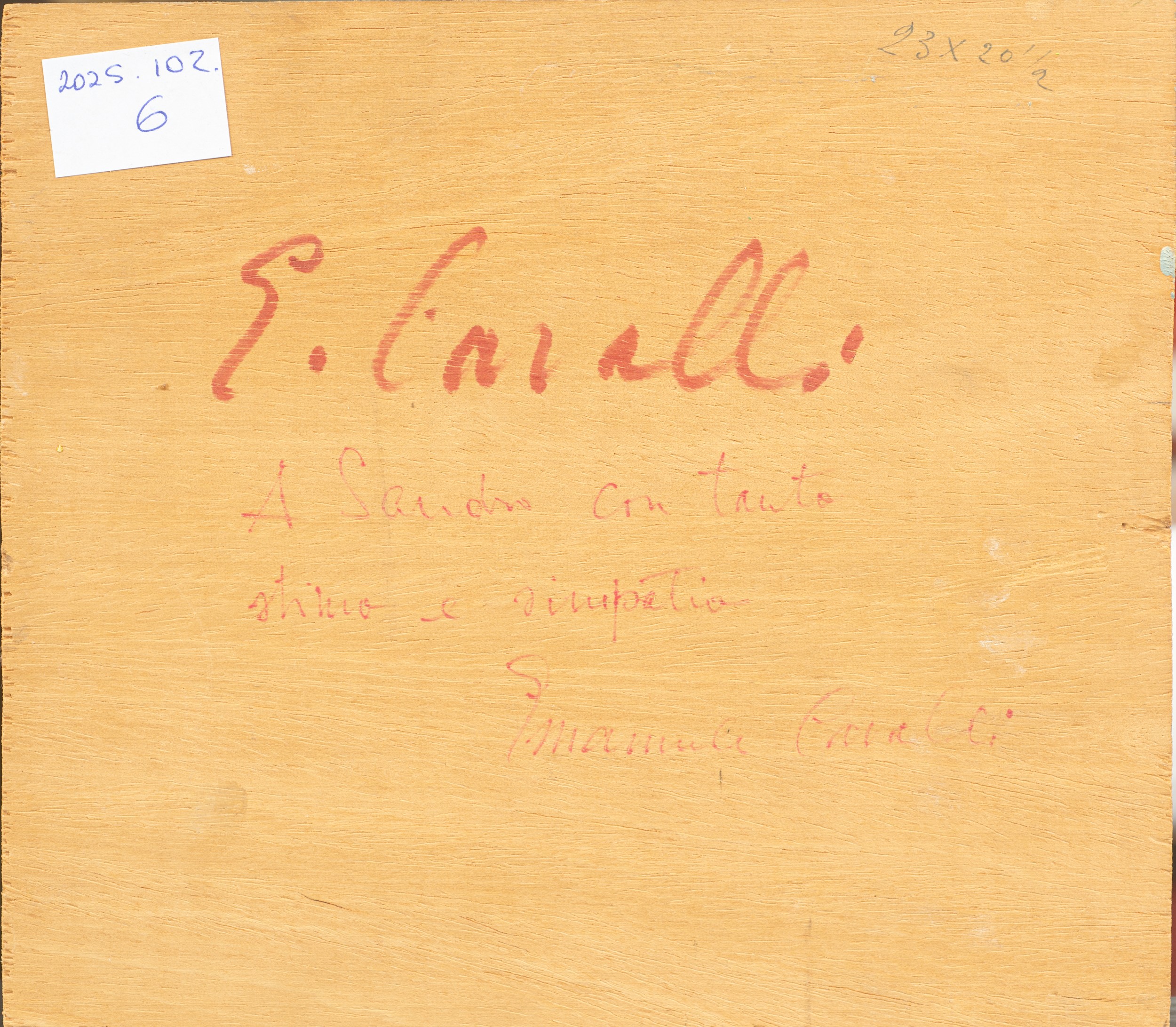 Opera firmata in basso a destra: "E Cavalli". Recante al retro iscrizioni autografe del Maestro: "E. Cavalli A Sandro con tanta stima e simpatia Emanuele Cavalli".