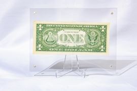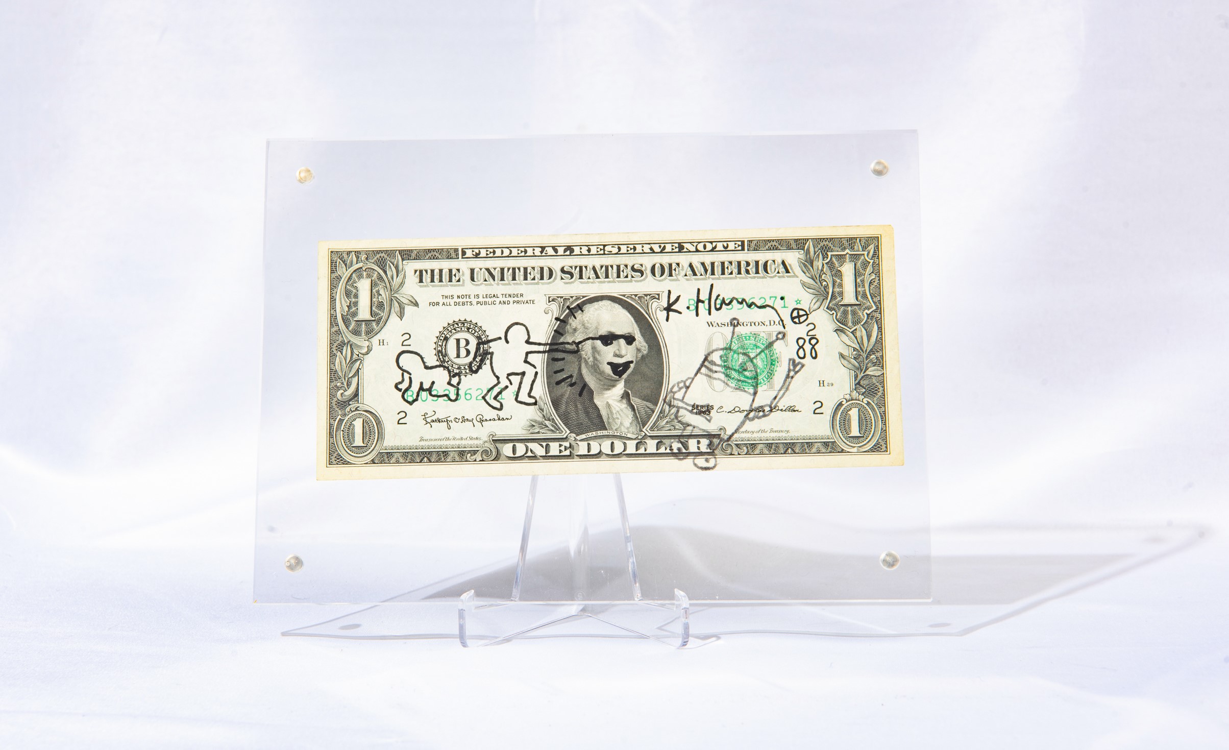 Disegno a pennarello nero datato in centro a destra "88" e firmato in alto a destra "K.Haring", su una banconota da un dollaro; con certificato di autenticità FPG: 44126 da parte di Frank P. Garo (forensic handwriting examiner autetntication and grading service) del 29/10/2025