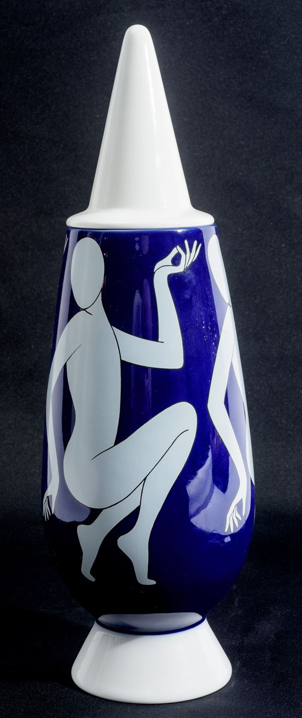 Decorata a decalcomania applicata. Serie "100% Make-up". Marchiato al retro della base: "A. Mendini; Mark Kostabi". Produzione Alessi - Tendentse, Germany.