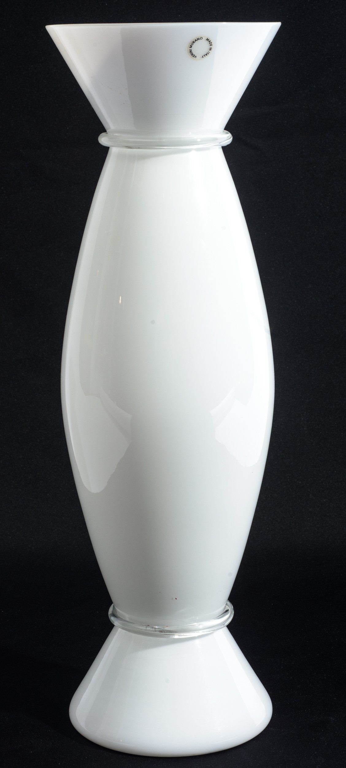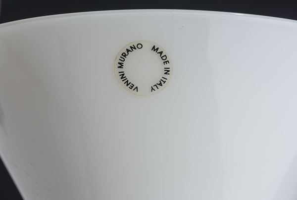 Vetro incamiciato bianco con anelli applicati a caldo in vetro incolore trasparente. Iscritto a punta sotto la base: "Murano 94 A. Mandini". Vecchia etichetta: Venini Murano Made in Italy.