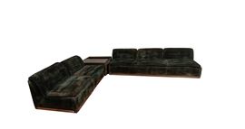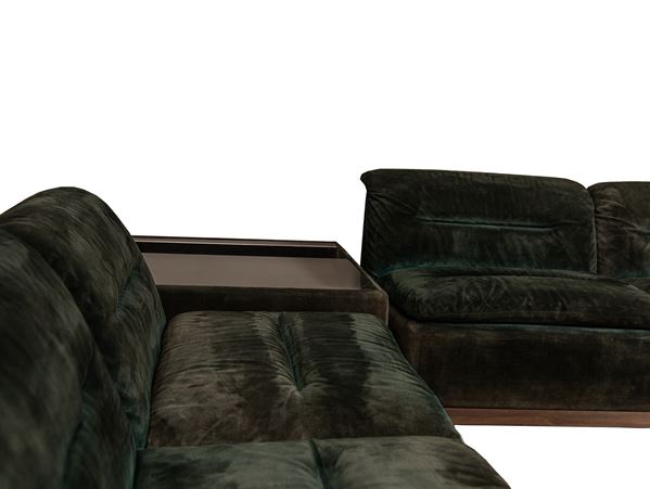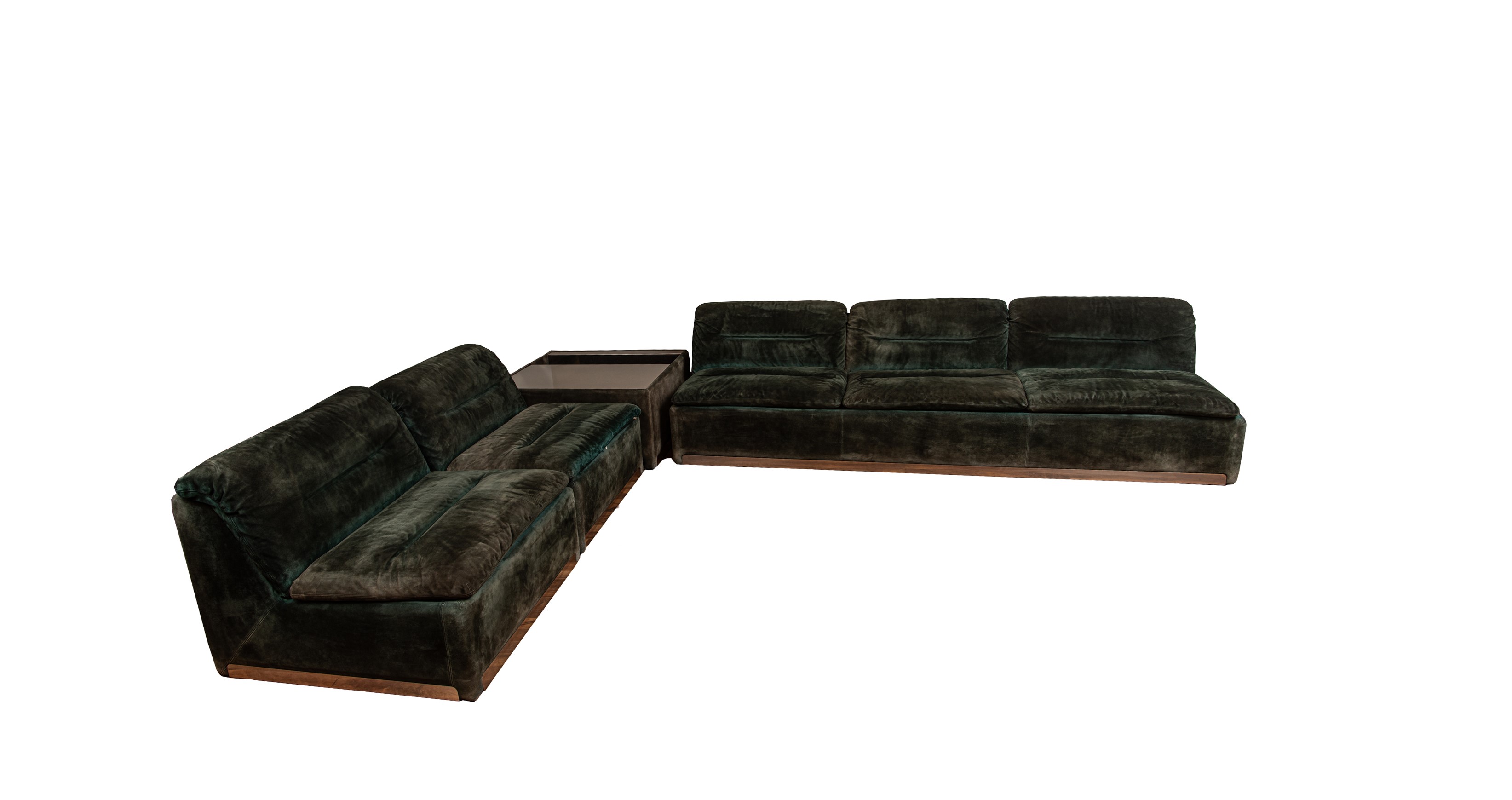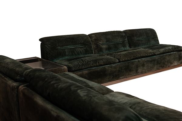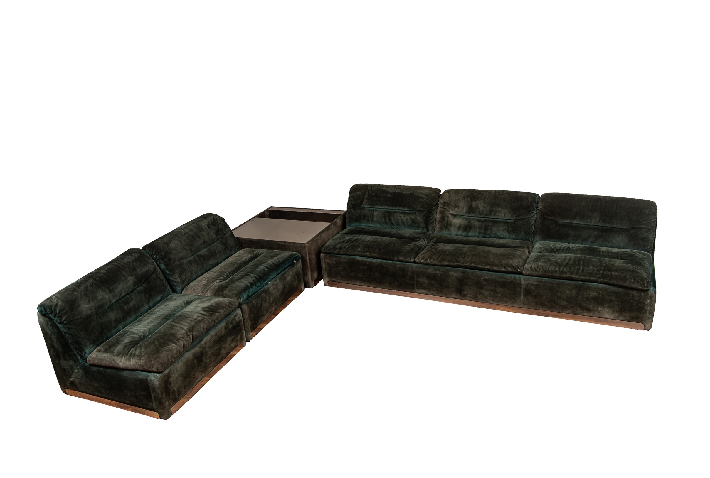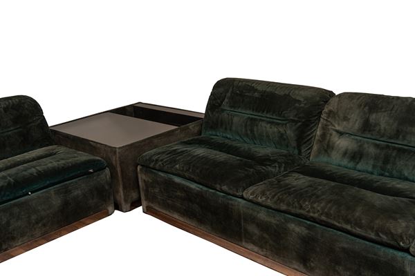 Per Saporiti, Italia. Il set รจ ancora rivestito nel suo velluto mohair originale. ร composto da un divano a 3 posti, 2 sedute singole e un tavolino quadrato con sezione ribassata in acciaio inox lucido. Le basi degli elementi del divano sono in acciaio inox spazzolato. Il piano del tavolo in acciaio inox lucido presenta alcuni graffi. Marchi e etichette di produzione. Misure: H. 60 x 251 x 87 cm; 1 elemento del divano H. 60 x 84 x 88 cm e il tavolino 87 x 87 x 42 cm