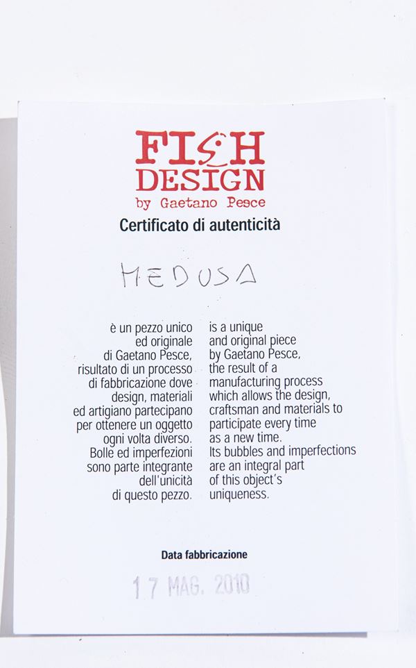 Per Fish Design. Marchio di fabbrica alla base. Opera presentata da certificato di autenticità
