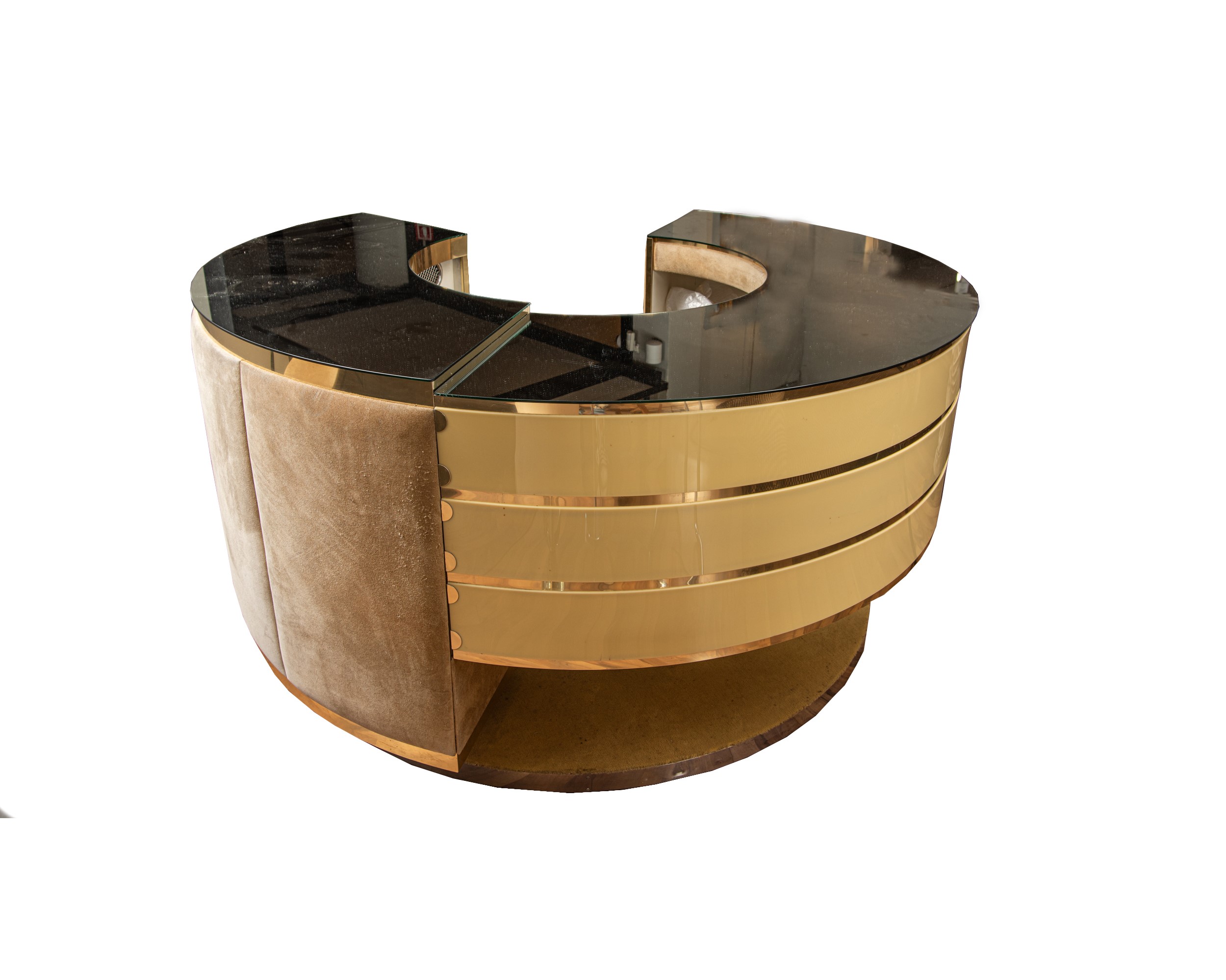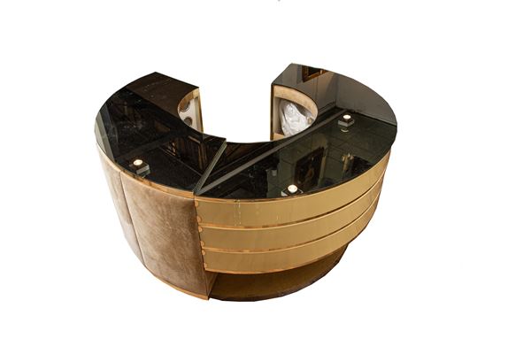 plexiglass, alluminio, ottone e tessuto scamosciato