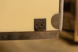 Per Stilfrigo Selezione. Ripiano superiore in vetro specchiato. Etichetta con marchio di produzione al lato. Dimensioni sgabello: 82 x 32 x 31 cm. Segni di usura