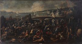 Il trattamento del paesaggio, con veduta marittima, architetture idealizzate e atmosfera fumosa, rivela un interesse per la dimensione narrativa ampia e articolata, tipica della cultura figurativa napoletana del Seicento. L’articolazione spaziale su diagonali convergenti e la densità figurativa del primo piano costituiscono elementi coerenti con la poetica dell’artista, incline a rappresentazioni di episodi biblici o storici ad alto contenuto drammatico.
