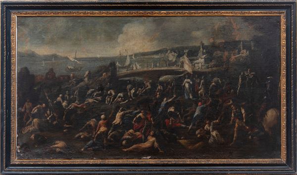 Il dipinto raffigura una drammatica scena di battaglia ambientata presso un ponte che attraversa un corso d’acqua, sullo sfondo di un paesaggio costiero animato da imbarcazioni e architetture turrite. In primo piano si dispiega un concitato massacro: corpi riversi nell’acqua, figure in fuga, soldati armati di lance e spade, cavalli imbizzarriti e gesti disperati costruiscono una narrazione convulsa e tragica.