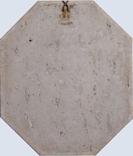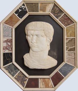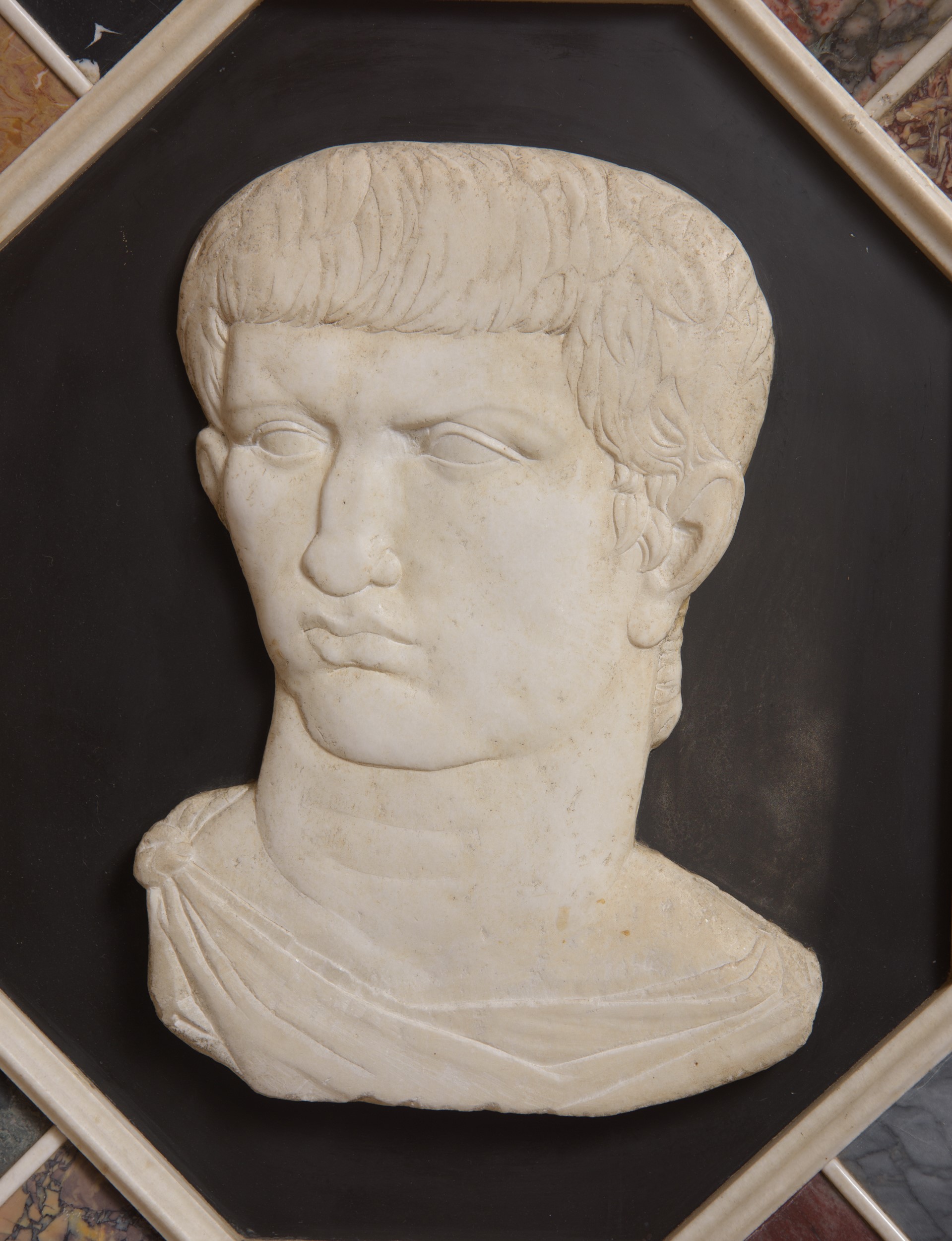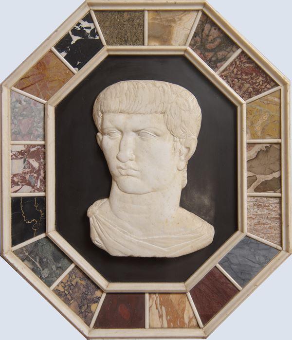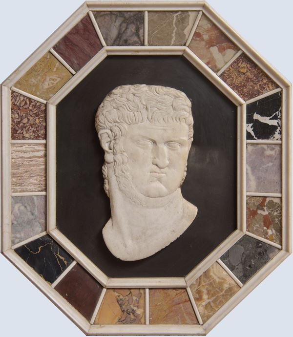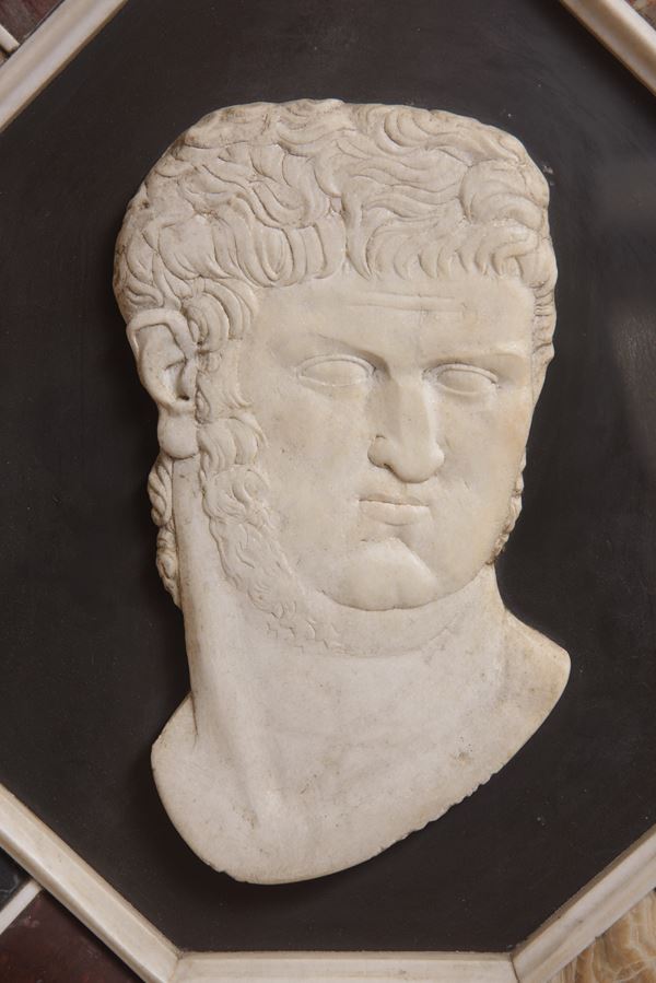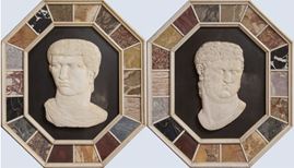 Coppia di bassorilievi di forma ottagonale con cornice a campionatura di marmi vari. La parte centrale raffigura volti di imperatori romani in marmo bianco statuario, applicati su fondo in marmo Nero del Belgio.