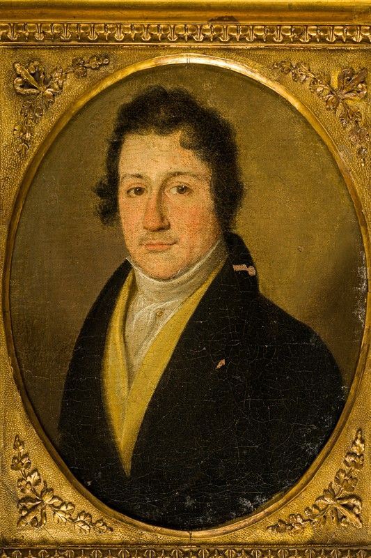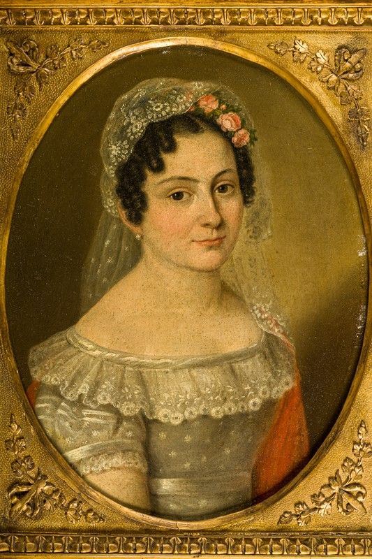 The married couple, portrayed on oval-trimmed canvas, are represented on their wedding day.