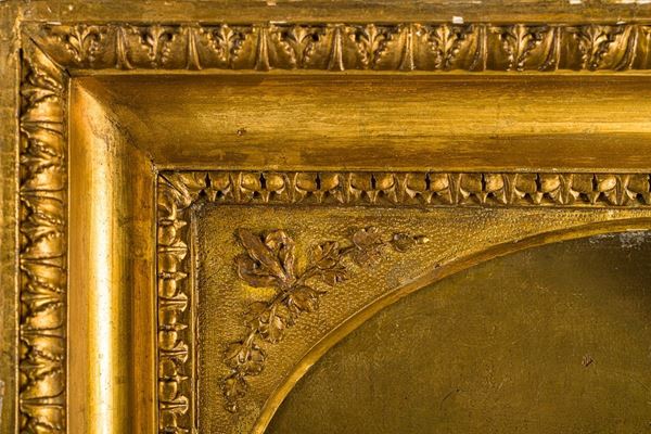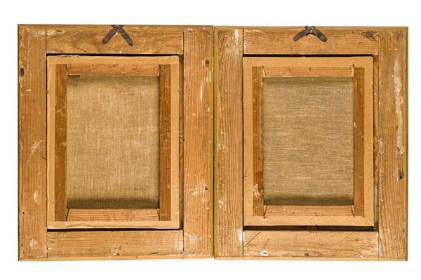 The portrait of the bride appears in good condition except for small spots of humidity visible in the lighter parts. There are no restorations visible on examination with Wood's Lamp. The frames show some detachment of gilding.
