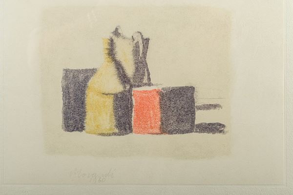 watercolor print, taken from the series by Valerio Zurlini, "50 watercolors by Giorgio Morandi", Ilte publisher, Turin 1973, signature and date printed on the lower left, stamped on the reverse "Stampa Ilte, Turin", framed
