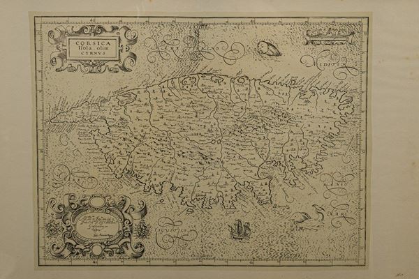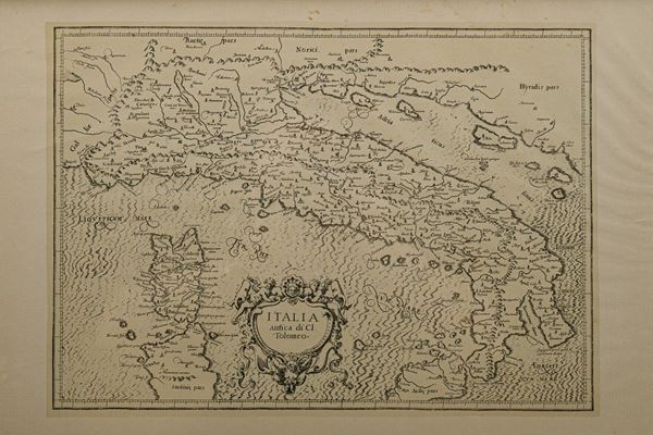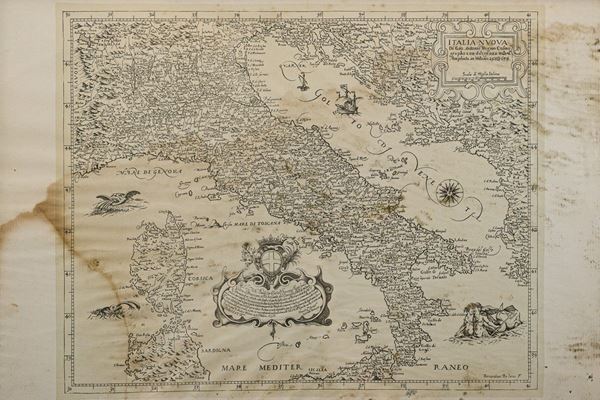 of which "Italia Nuova", "Italia Antica di Cl. Tolomeo" and "Corsica, All'Ill. and Rever.mo Sig.er Pron. Col. Card. Benedetto Giustiniano", with double glass, framed, breaks and stains