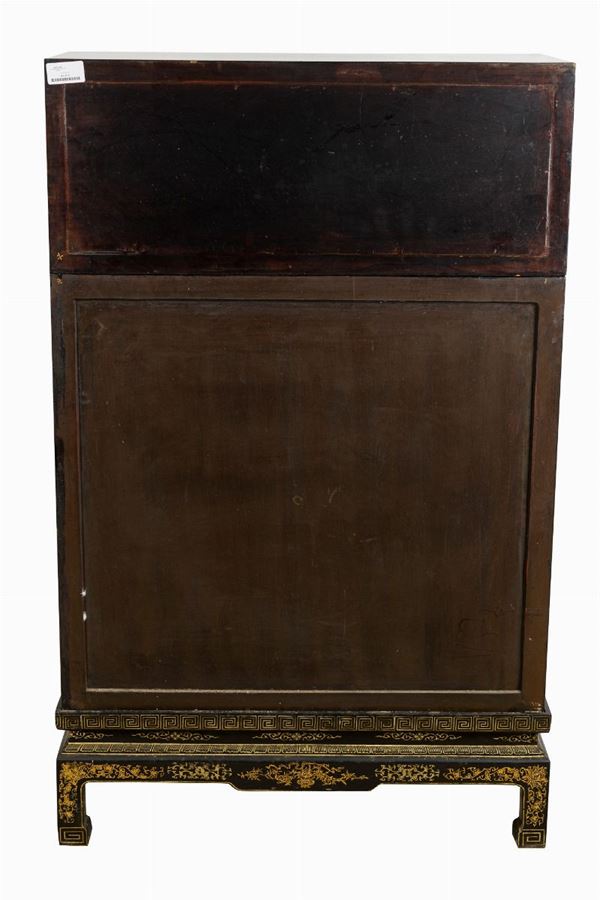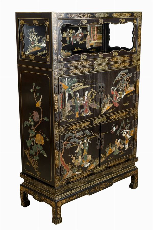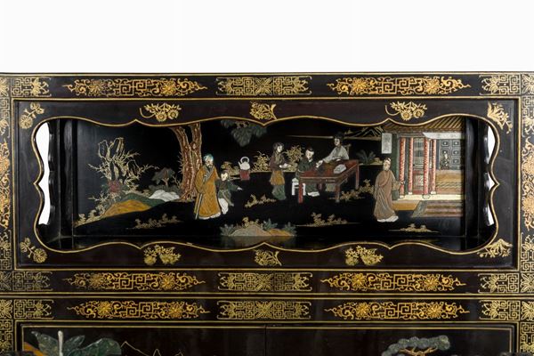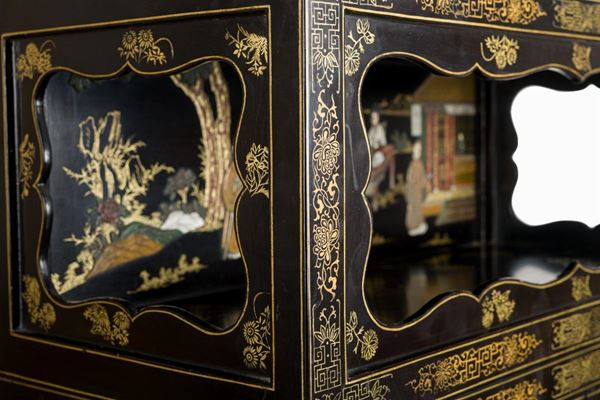 in lacquered wood, with inlays in ivory and semi-precious stones, gilded and enameled decorations, with genre scenes and floral motifs, defects