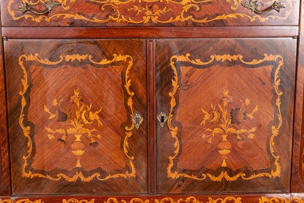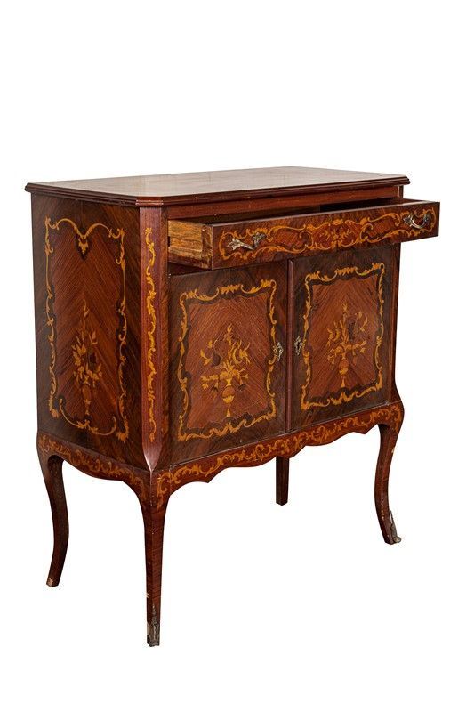 with two doors and a drawer, in walnut wood with fruit wood inlays, arched legs