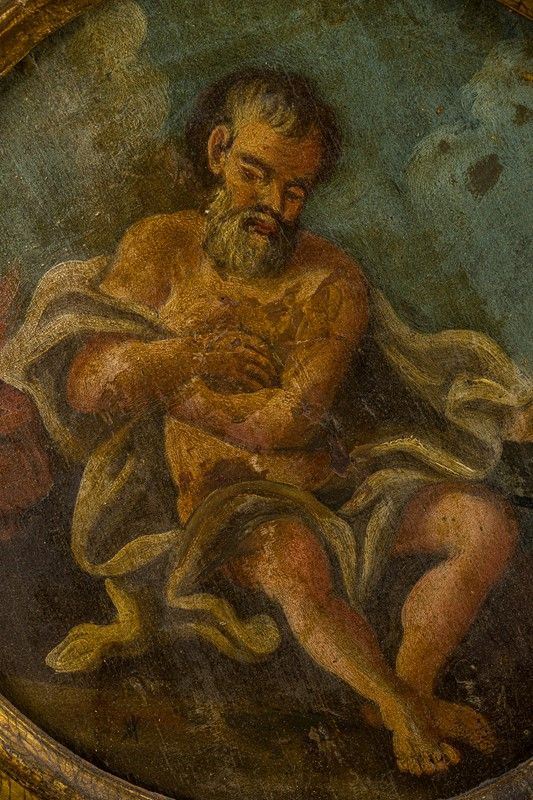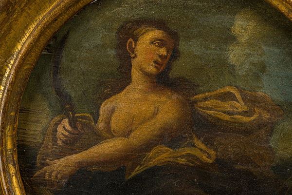 The personification of Summer, in the guise of Ceres with a rich drapery with bare breasts, holds the scythe of the harvest in his right hand and with his left indicates a sheaf of wheat ears. Winter is depicted in the guise of a male divinity next to a brazier with a live fire. Framed.