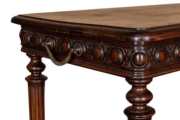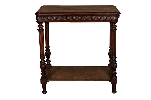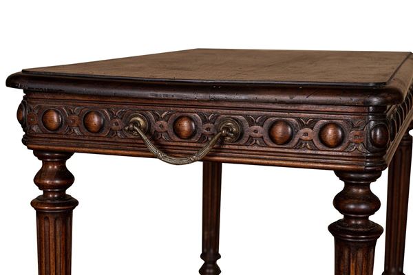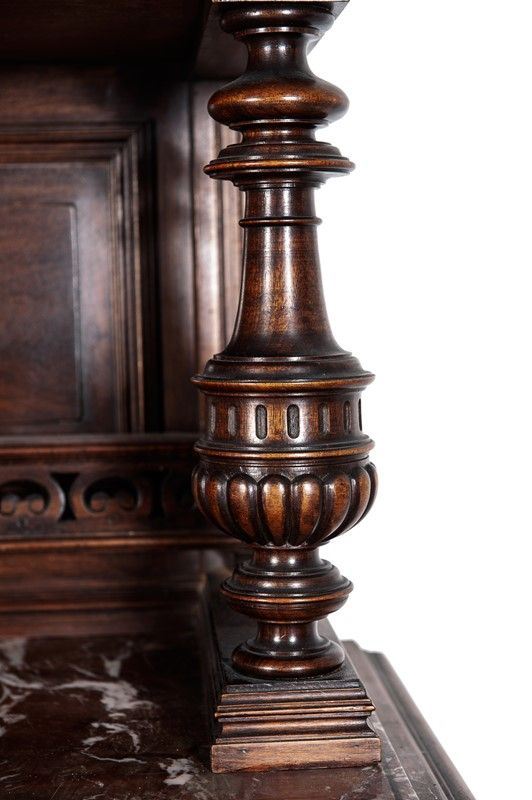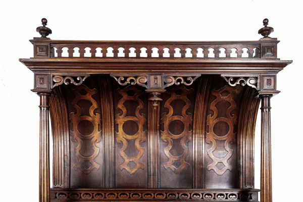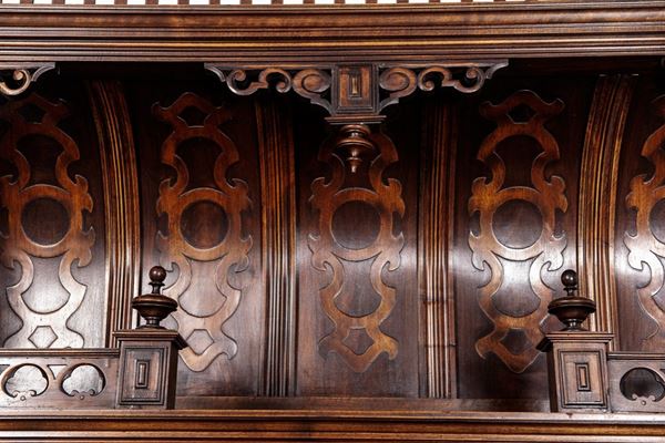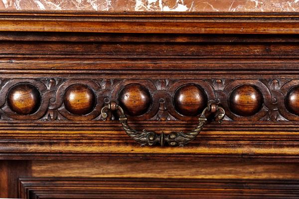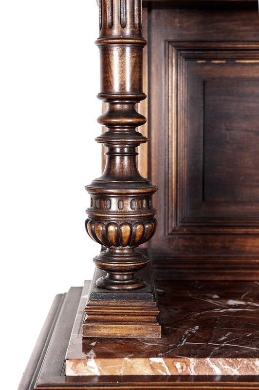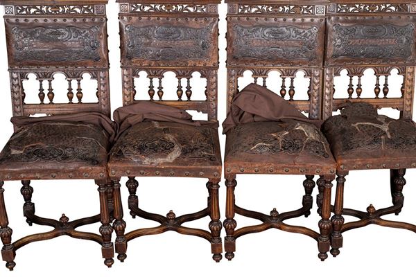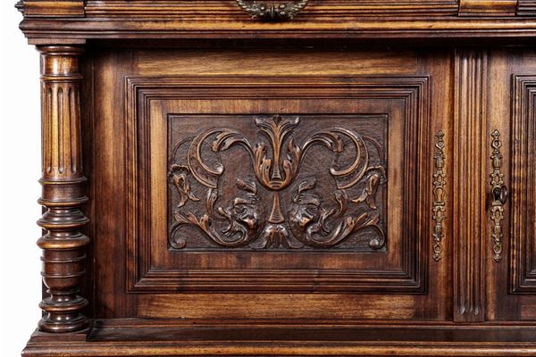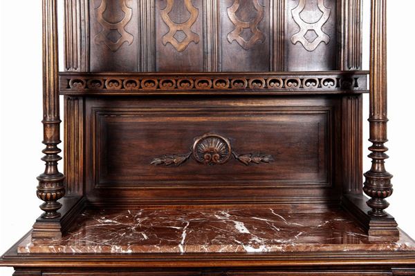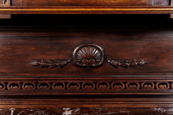 Renaissance taste, in carved walnut, composed of: 12 chairs, many in serious condition (105 x 44 x 43 cm), buffet sideboard with marble top (220 x 54 x 160 cm), counter-buffet sideboard with marble top (220 x 45 x 142 cm), dining table (80 x 140 x 160 cm), service table (74 x 43 x 72 cm).