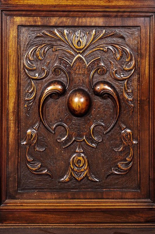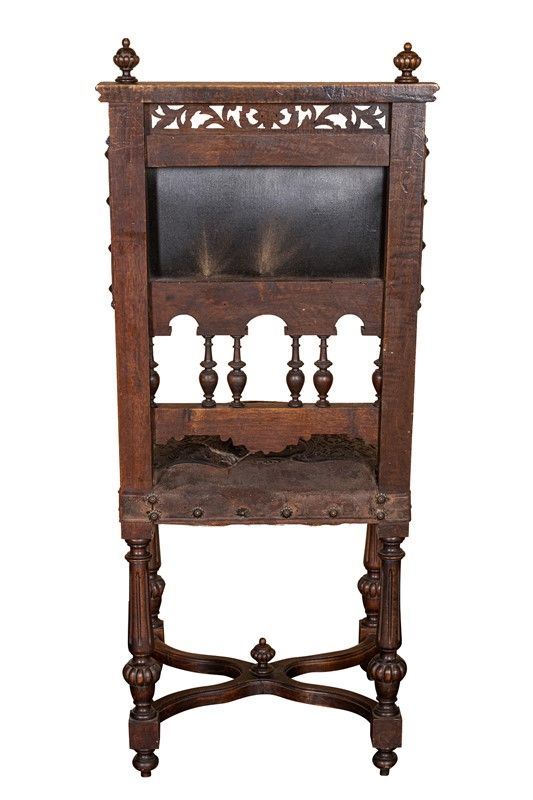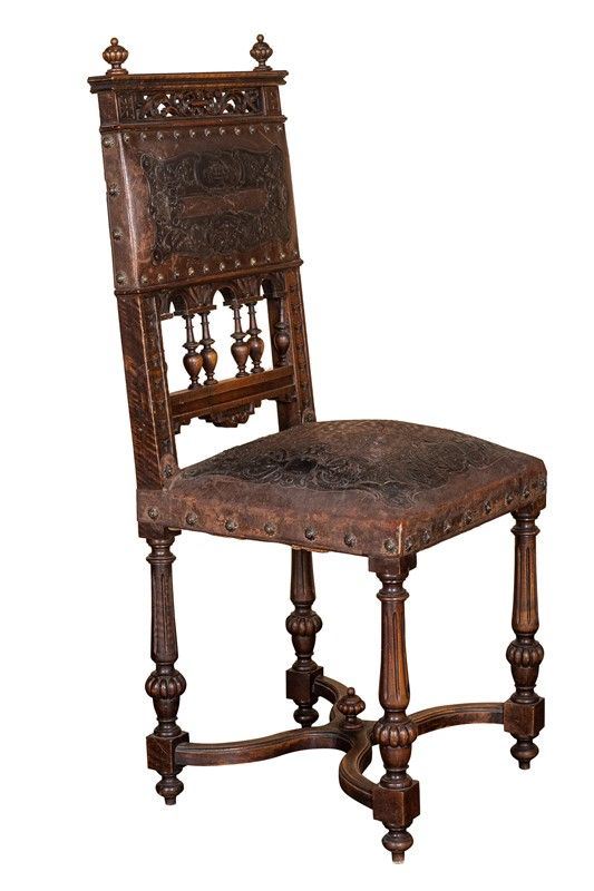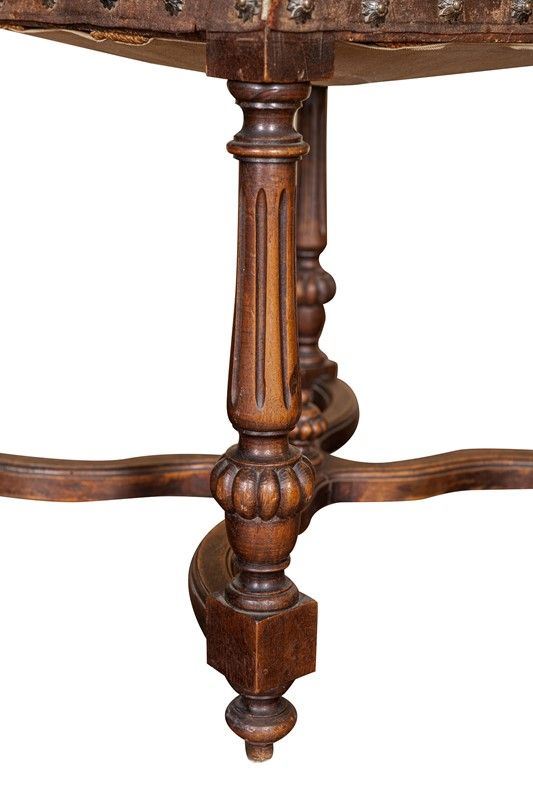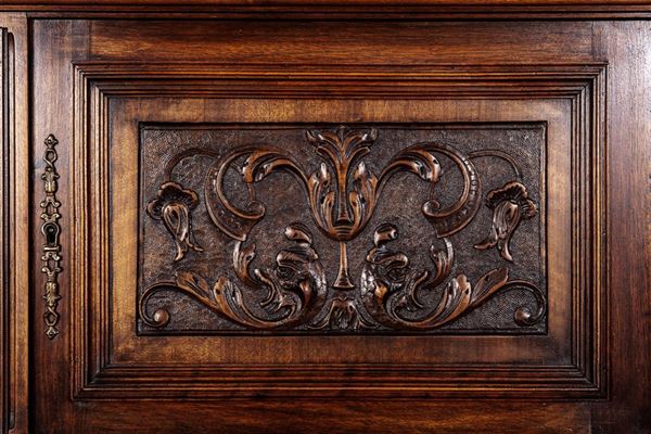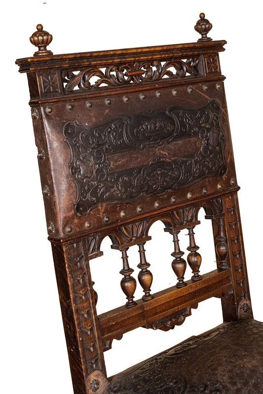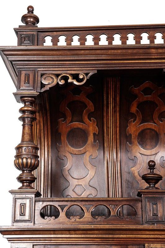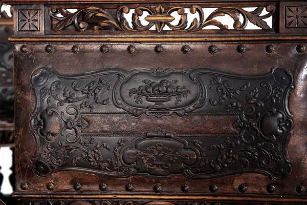 Renaissance taste, in carved walnut, composed of: 12 chairs, many in serious condition (105 x 44 x 43 cm), buffet sideboard with marble top (220 x 54 x 160 cm), counter-buffet sideboard with marble top (220 x 45 x 142 cm), dining table (80 x 140 x 160 cm), service table (74 x 43 x 72 cm).