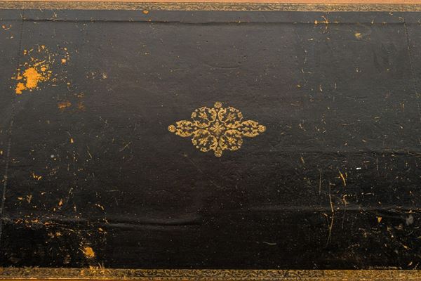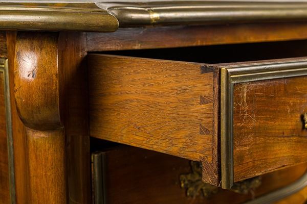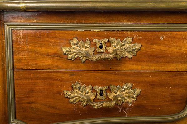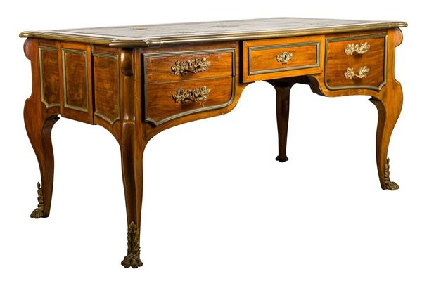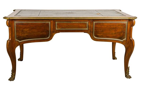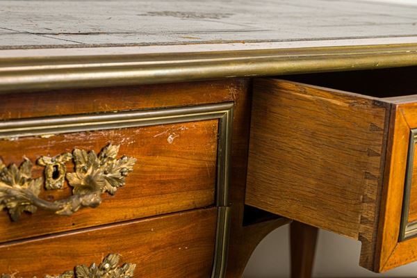 in walnut wood and bronze trim and decorations, top in worked leather, feet in the shape of lion's paws, defects