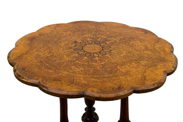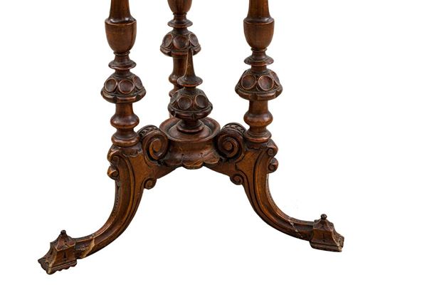 finely inlaid shelf and turned legs, with scroll decorations, defects and breaks