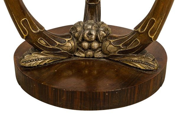 in walnut wood, with double shelf, shaped legs and decoration of fruits and flowers, defects