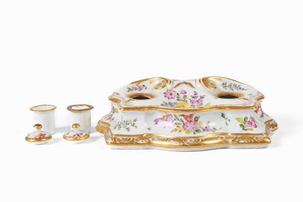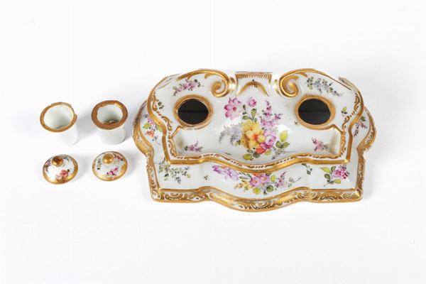 In white porcelain, with two bowls, a mixtilinear rectangular body, with floral decoration on a white background and pure gold finishes.
