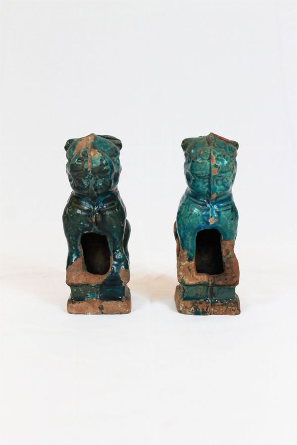 Volume sculptures in blue lacquered terracotta in the shape of Pho Dogs. Defects and shortcomings.