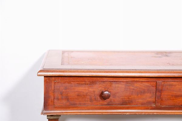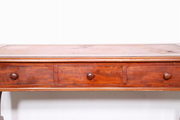 with 3 drawers, with leather top, two ace-shaped legs of cups connected to the base. Wear on the top