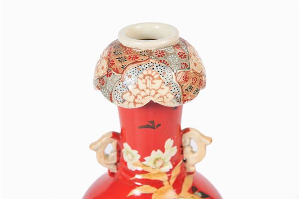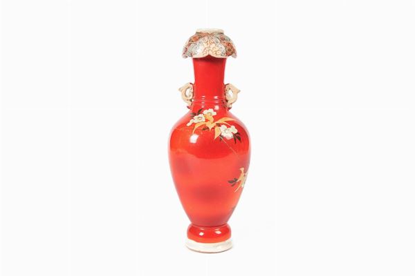 in porcelain with an orange background, decorated with birds and flowers. Missing part.