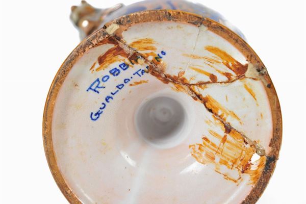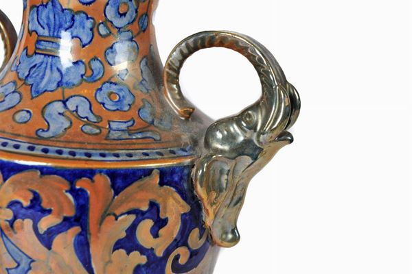double handle in the shape of an elephant trunk, with ramages decoration on a gold and blue background. Robia Goaldo Tadino Manufactory. Restorations on the foot and edge of the vase.