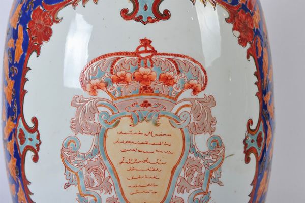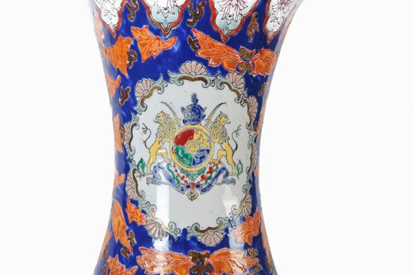with a trumpet neck, daisy rim, pear shaped body on a circular base. Decoration with ocher leaves in relief on a blue and white background. Two large reserves on a white background with an inscription inside the shield. Breakdowns and restorations.