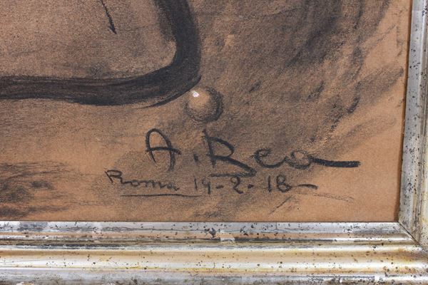 disegno su carta a matita a carboncino con rialzatura a biacca, firmato e datato sul fronte in basso a destra, entro cornice non coeva