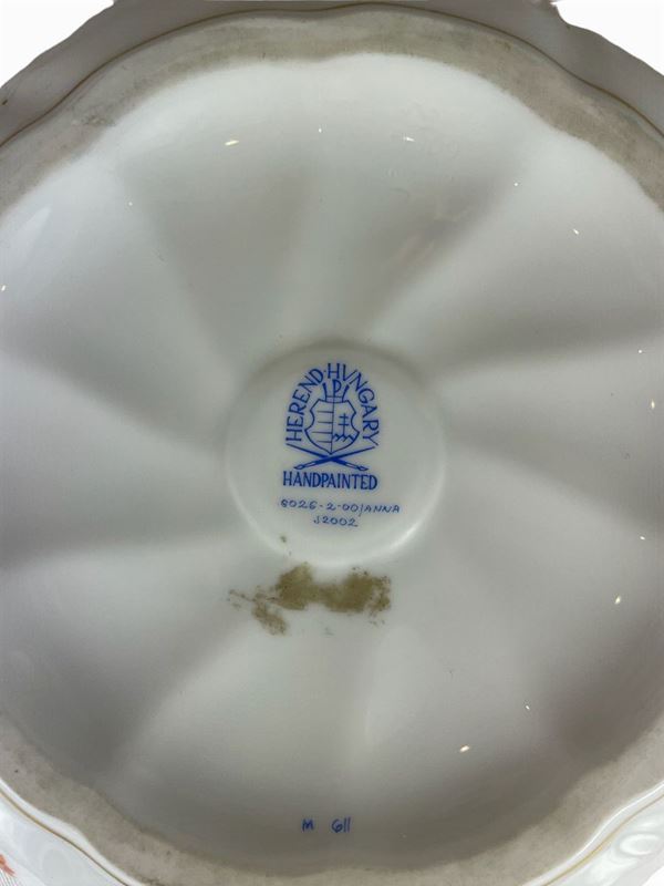 in porcellana bianca Herend Hungary, con decorazioni floreali e insetti, con fiori policromi a rilievo sul coperchio, stampigliatura alla base.
