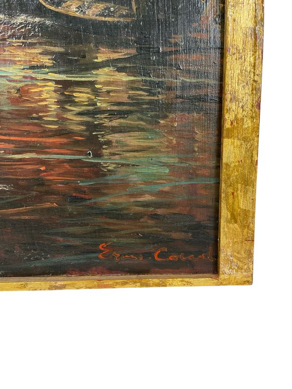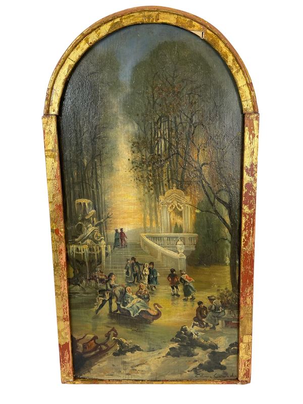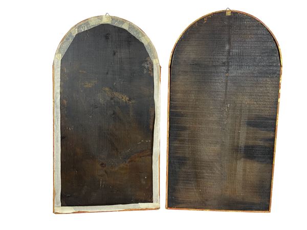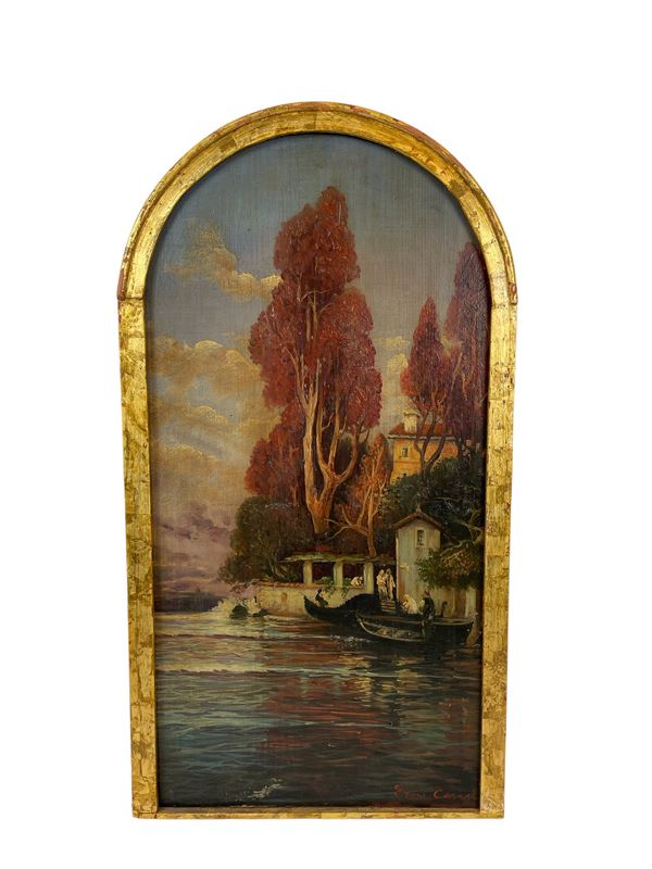 Coppia di dipinti, paesaggi autunnale ed invernale, su tavola entro cornici dorate. Firmati in basso a destra.