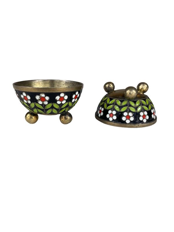 Coppia di saliere in argento con smalti policromi a motivi floreali. Peso grammi 65.