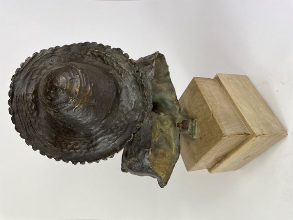 Scultura di bronzo in volume di giovanetto su base in pietra. Firmato in basso a destra (De Pietro?) Napoli inizio XX sec.