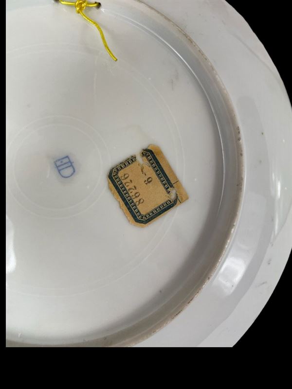 In porcellana policroma: il primo è con riserva centrale raffigurante scena di genere con Diana e Amorino, entro fascia verde con decorazione floreale in oro zecchino; il secondo è in porcellana con decorazione centrale entro riserva con Apollo e le Baccanti, contornato da fascia verde sulla tesa, con decoro floreale in oro zecchino.
